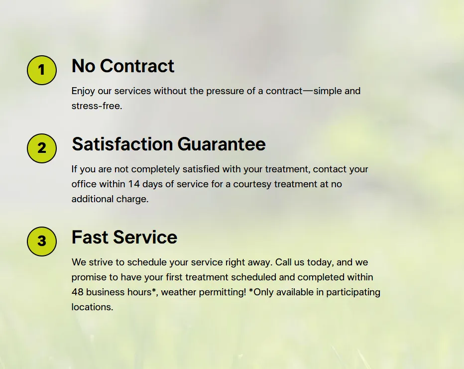 From your home’s perimeter to the property line, Mosquito Squad is passionate about helping protect from the potential dangers and irritations that bloodsucking pests bring to your space. Fighting mosquitoes, ticks, and other pests is as easy as 1-2-3!